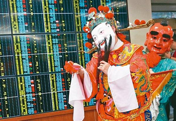 昨天是初六上班日,台股開紅盤,收盤大漲293點;證券公司也請來財神跳加官,為狗年股市祈求長紅。 記者林俊良/攝影