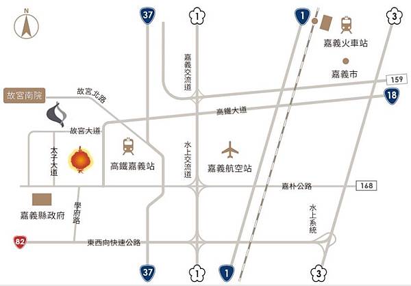 高鐵嘉義站:搭105、106、166、168、7702及黃9至故宮南院站下車