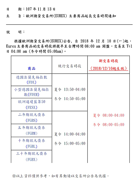 根據歐洲期貨交易所(EUREX)公告, 自2018年12月10日(一)起,Eurex主要商品的交易時段將提早至台灣時間08:00 am 開盤,交易至T+1日04:00 am (冬令時間05:00am)。