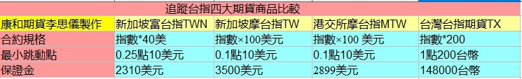 期貨女王幫大家整理出追蹤台指的四大期貨商品合約規格差異,新加坡證券交易所發行的富台期昨天7月20日正式上囉!