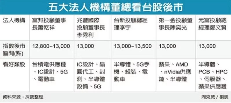 台新投顧總經理李鎮宇則認為,以外資調高台積電、聯發科目標價區間來看,台股有機會進一步上看13,500點;第一金投顧董事長陳奕光、元富投顧董事長鄭文賢認為,台股再衝關的主流仍是電子股。