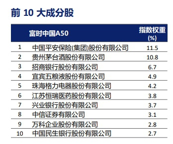 新華富時中國A50指數是由新華富時指數公司編製。A50指數是根據新華富時A股指數編製規則,從A股市場選擇合格的最大50家公司組成的指數。包括了中國聯通、招商銀行、中石化、寶鋼、深圳發展銀行、長江電力、上海汽車等大盤股。A50指數占有A股市場流通市值的33.2%,新華富時中國A50指數與上證50指數高度相關,屬於競爭性指數。