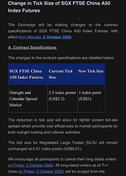A50投資人注意! 新加坡交易所要把A50最小跳動點>>改成1跳1美元喔!