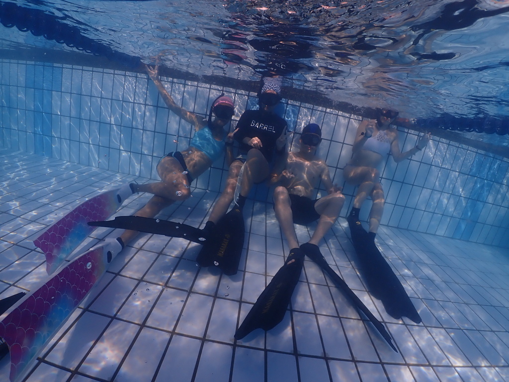 早上泳池訓練結束,教練說大家趴在泳池底部合照~結果大家一直不同步飄起來 哈哈哈