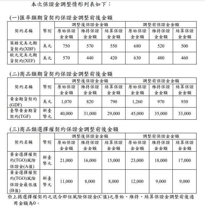 【7/14日匯率期貨、黃金期貨保證金調整名單】