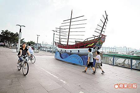 今年重新打造的唐山仿古船,是大稻埕碼頭的搶眼地標。新店溪與淡水河自行車道是我喜愛的單車路線,習慣以公館作為起點,時間足夠和體力許可,就會沿著新店溪畔,一路接至淡水河畔前往大稻埕碼頭。 公館到大稻埕碼頭的這段路約11公里,首先會經過一處穿梭於草坪間的「S」形彎道,平整而寬敞的綠地,經常可見到鴿子,即便靠近牠們,鴿子也完全不以為意,相當有趣,讓人在單車小旅行的初始,就有好心情。 緊接著還能碰上一塊塊又紫又白的花圃,在秋風中迎風擺動,足以動人心弦。這一段路程最令人覺得舒服的地方,就是沿途有成排大榕樹、交疊的枝椏猶如天然大遮棚,騎累了,就坐在樹下喝口水、歇息一下,享受從河面吹來的涼風,也是一份難以言喻的暢快。