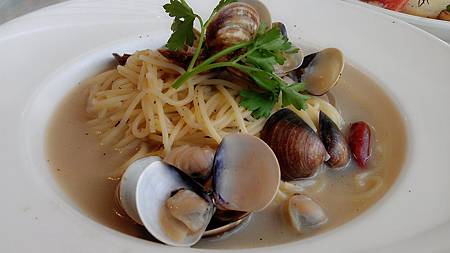 我個人不敢吃生魚片,所以聽朋友說還不賴 第四道 蒜香白酒蛤蜊義大利麵