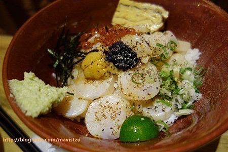 北海道干貝丼,一次給你六顆超大又鮮甜的北海道干貝,外加鮭魚卵及海膽,滿滿的新鮮海味一次滿足 北海道干貝丼。 麻米絲機美食玩樂趣