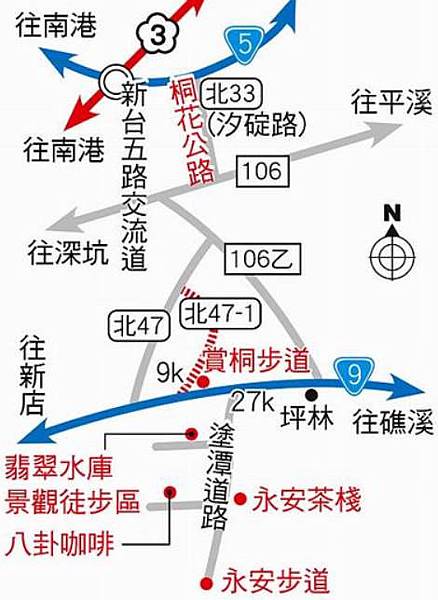 賞桐步道、翡翠水庫景觀徒步區、八卦咖啡、永安茶棧、永安步道 台北捷運新店站轉綠12公車,賞桐步道於風露嘴站,八卦咖啡、永安茶棧於13股站下,其餘景點於小金瓜寮站下。
