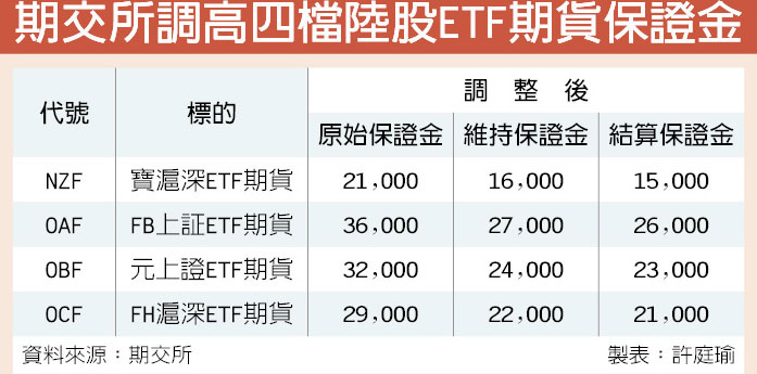在調高保證金的商品上,包括寶滬深ETF期貨契約(NZF)、FB上証ETF期貨契約(OAF)、元上證ETF期貨契約(OBF),以及FH滬深ETF期貨契約(OCF),這四檔商品為台股中成交量較大的陸股ETF,平均每日成交量在萬張以上。
