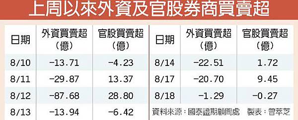 期貨小靜來報新聞囉! 【台股續破底官股券商反倒貨】 國內今年GDP成長率大舉下修、台幣貶值等負面效應持續在市場發酵,官股券商昨日合計呈現賣超0.27億元,似乎沒護盤反而還倒貨,讓股民心生疑竇。   最近官股券商的操作確實很保守,上周以來已出現3個交易日與外資同步賣超的現象,這與之前外資賣超、官股券商就進場買超的手法大不同,也難怪近期台股特別弱。   上週以來包括昨日在內,已經有三個交易日,外資賣超時,官股券商仍同步賣超,八大官股此時不僅不護盤,竟還倒貨倒打台股一把,在內資、散戶退場,台股連日量創新低之際,官股券商偏空的操作將拖累台股。     國際股市: | 美國股市 | 收盤價 | 漲跌 | 漲跌幅 |  | 道瓊指數 | 17511.34 | -33.84 | -0.19 |  | 那斯達克 | 5059.348 | -32.35 | -0.64 |  | S&P500 | 2096.92 | -5.52 | -0.26 |  | 費城半導體 | 624.01 | -13.24 | -2.08 |