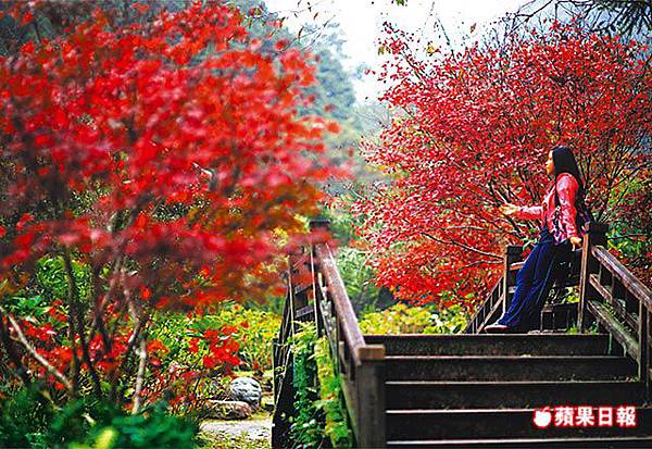 杉林溪森林生態渡假園區隸屬南投竹山鎮,海拔介於1600~1800公尺,園區佔地廣達350公頃,秋冬時節經常雲霧繚繞,迷離山色清幽浪漫。杉林溪裡屬藥花園最有季節感,近百株紫葉槭已由夏季的紫紅色逐漸蛻變為秋冬的豔麗寶石紅,搭配木棧橋、水池、風車等,十分容易取景。紫葉槭從低彩度的死氣沉沉紫紅色,換上紅寶石秋季妝容,老嫗一秒變姐姐,頓時成為花園裡最吸睛的女主角,連落葉都淒美。今年午後陣雨多,加快落葉速度,想一賞美人之姿,得趕在11月中前。