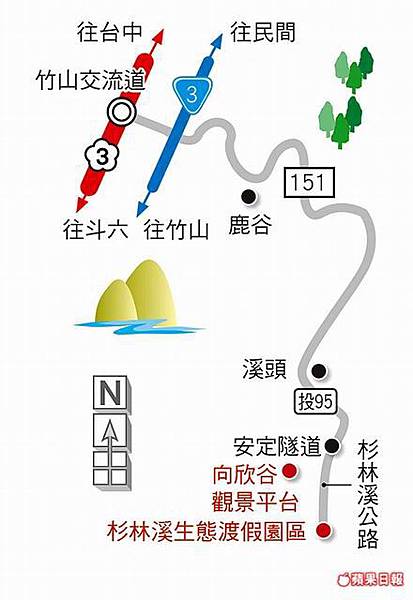 ★開車:國道3號於竹山交流道下,接台3線轉151縣道,過溪頭接投95鄉道(杉林溪公路)可抵。