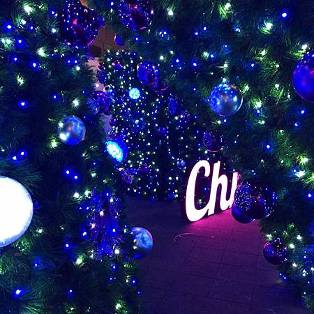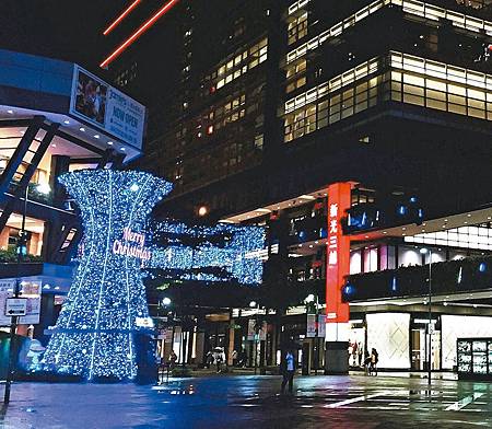 京華城館內1樓京華大道展開聖誕點燈活動,高250公分的街燈搭配彩色繡球花點綴街道,高150公分及210公分的白色聖誕樹鑲上俏皮紅球,閃爍的藍白色LED星光燈海營造童趣又浪漫的聖誕公園。