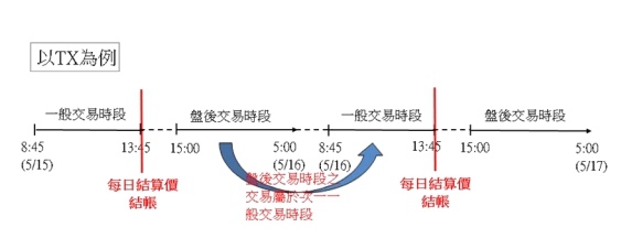 A2:盤後交易時段之交易屬於次一一般交易時段,其交易、結算等相關作業,除另有規定外,於次一一般交易時段辦理。期交所每一交易日僅於一般交易時段收盤後決定並公告每日結算價,同時進行結帳作業,盤後交易時段收盤後,期交所不另行公告每日結算價。