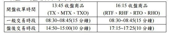 2.16:15 收盤商品 :17:15 收單、17:25 開盤(收單 10 分鐘、盤前 2分鐘不得刪除或修改委託,僅得新增),交易至次日 05:00