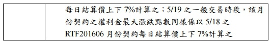 2.匯率類商品:小型美元兌人民幣期貨(RTF)、美元兌人民幣期貨(RHF)、小型美元兌人民幣選擇權(RTO)及美元兌人民幣選擇權(RHO)。