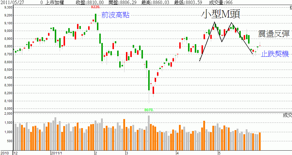 5/27:上升量增該怎麼解讀呢?從5/24最低點8673到今天的最高點反彈將近兩百點,雖然沒有止跌氣勢,但上升量增可以視為止跌契機。換句話說,短線無須追空。