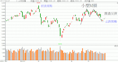 這次的M形頭部不大,所以拉回的幅度有待確認,而5/27出現止跌契機,如果真能止跌,就會開始作震盪反彈,屆時的重點就在震盪逃命波與回升行情的判斷。因為篇幅有限,有關反彈與回升的判斷請讀者先參考「技術分析不設防」,下期cola會詳細分解。