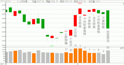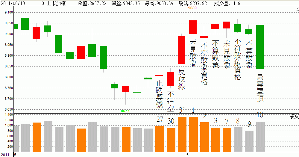 6/9:開低走低收小黑,這樣應該算敗象了吧?今天的小黑跌幅不大,加上昨天總共也才跌了55點,這能算敗象嗎?cola認為這樣的審核標準實在太過嚴苛,換句話說,只許漲不許跌。我想天底下的市場沒有這樣的道理,台股也不例外。所以我不認為這是敗象。