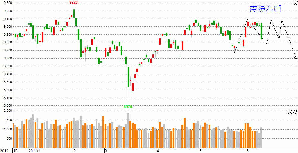 圖三,開始作震盪右肩逃命波,拉高就是賣點。至於何謂震盪右肩呢?就是以震盪三小波反彈來完成右肩型態。換句話說,接下來的走勢偏空的機率比較大。