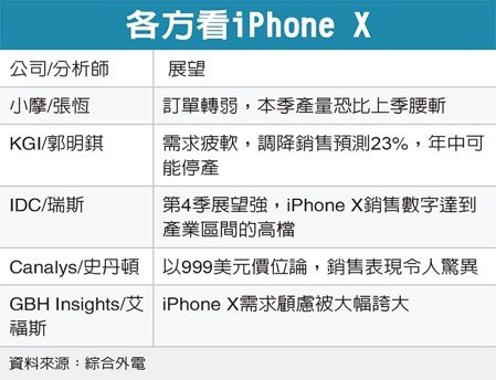 iPhone X是在去年11月上旬開賣,由於售價過高等因素,近期屢屢傳出銷售雜音。iPhone X上季僅在市面兩個月,小摩此次預估本季iPhone X產量將較上季腰斬,等於宣告現階段的iPhone X三個月銷量還賣輸最初的兩個月,凸顯市場需求疲弱。