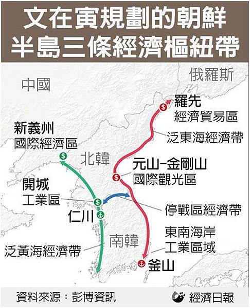 南韓總統文在寅的計畫中,包括發展三條經濟帶,先將南韓的工業腹地與北韓連接,之後再延伸到中國及俄羅斯。