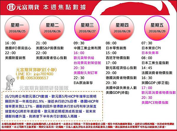 期貨小靜分享海期經濟數據 2018年6月25日(星期一)