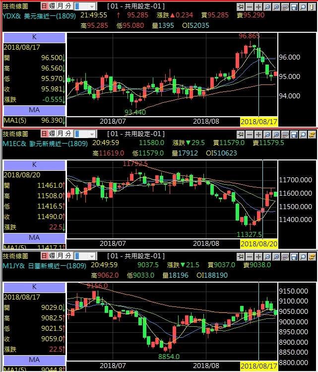 美元指數期貨技術分析/歐元期貨技術分析/日圓期貨技術分析比較圖