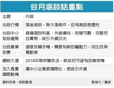 就市場結構來看,谷月涵認為,市場雖然較少關注中小型股,但外資對這類企業的興趣濃厚,應該加以推廣。他分析台灣中小企業的優勢有三,包括一、具備個別利基,二、外銷導向,三、財報可靠、完整而且實際,吸引外資目光。