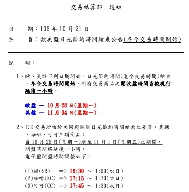 2、ICE交易所由於美國與歐洲日光節約時間結束之差異,其糖、咖啡、可可三項商品: