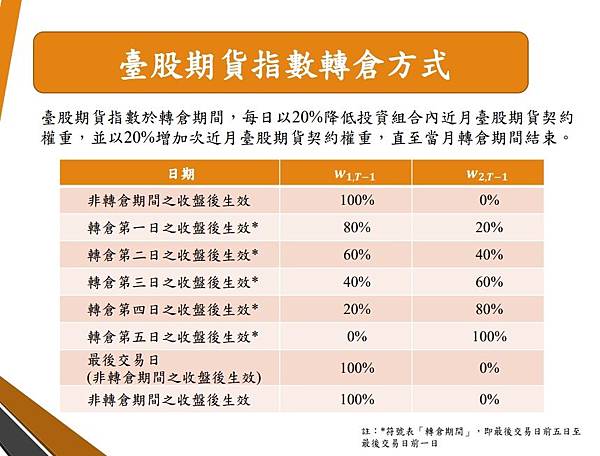 ◆指數投資需留意:轉倉時的近月、次近月期貨之價差將影響指數之績效表現。