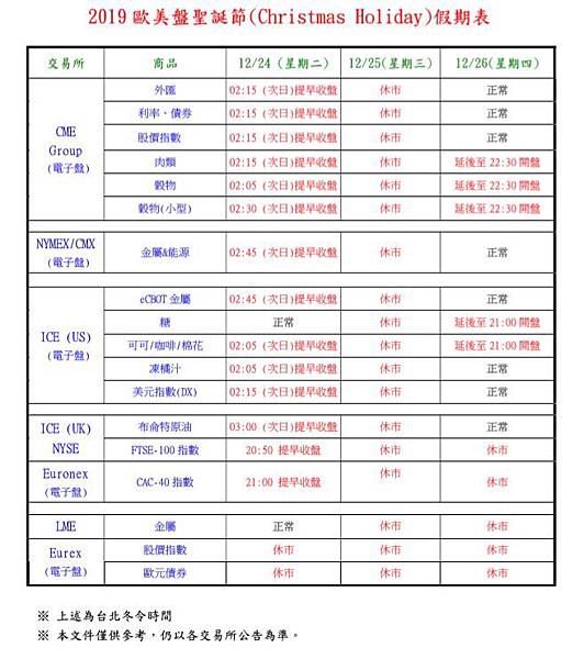 2019歐美盤聖誕節假期表(Christmas Holiday) 請參考圖表、以各交易所公告為準。