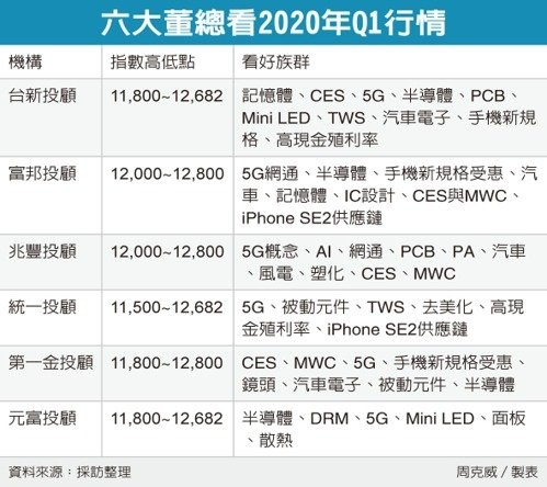 台股已叩「萬二」關卡,展望2020年行情有望改寫新高,統一、第一金、元富、富邦、台新、兆豐等六大機構甚至預期,元月行情看旺,第1季就有濃厚機會改寫新紀錄,包括5G、Mini LED、塑化、工具機、車用電子、半導體、記憶體、壽險、證券、高現金殖利率等族群,將是首季行情搶紅包的聚焦點。