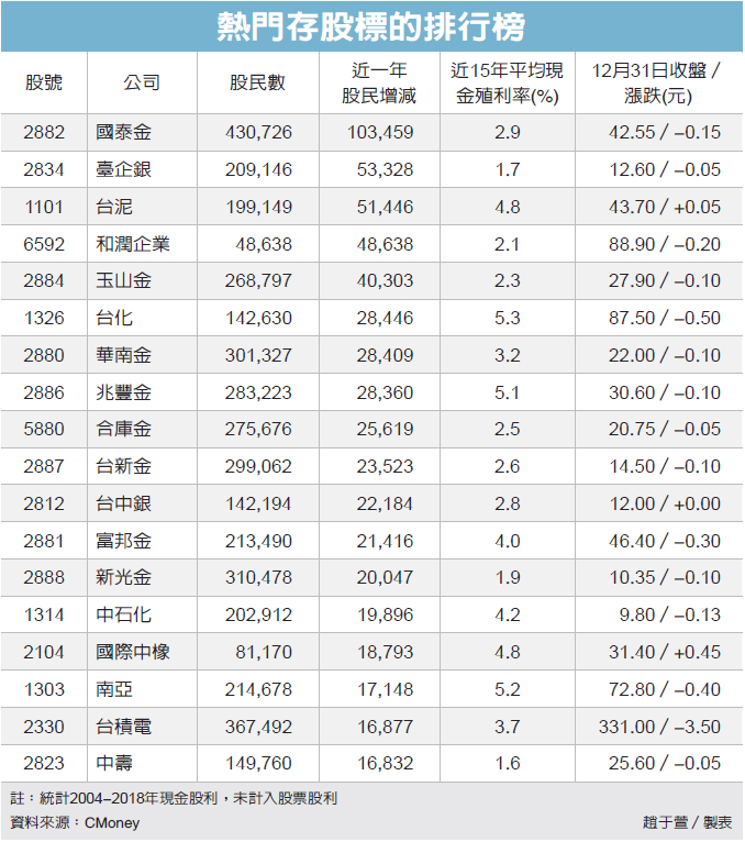 進一步統計,近一年股民數增加最多的20檔股票中,穩定配息股當道,印證台股結構丕變。其中,國泰金2019年表現雖不理想,卻愈跌愈有人氣,共計增加逾10萬股民、為人氣榜第一,其次為臺企銀增加5.3萬名股民,台泥增5.1萬股民第三。