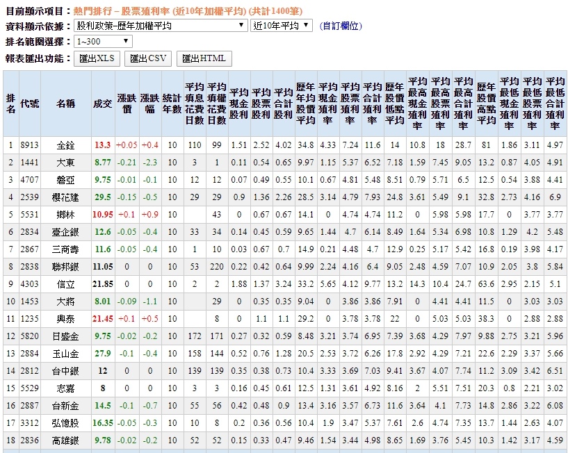 股票殖利率近10年平均排行