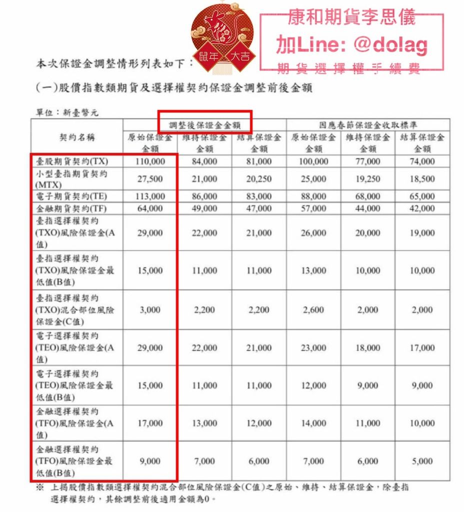 因應109年春節假期休市,期交所於春節假期實施調高股價指數類契約、商品類契約及匯率類契約保證金措施,並預計配合春節假期結束,於1月31日一般交易時段結束後恢復為調整前1月17日之保證金,惟鑑於近期國際股市波動較大,為強化交易人保證金風險承受能力及市場運作安全,期交所於1月30日公告調升臺股期貨(TX)、小型臺指期貨(MTX)、電子期貨(TE)、金融期貨(TF)、臺指選擇權(TXO)、電子選擇權(TEO)、金融選擇權(TFO)等7項契約保證金,上列契約外,原春節假期前公告調高保證金之各項契約,維持原春節保證金收取標準。