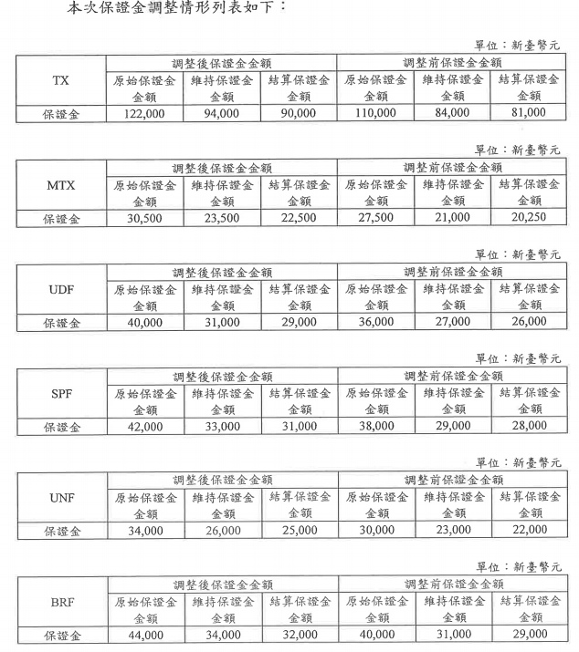 其中俗稱大台指每口保證金的台股期貨契約(TX),調整前原始保證金金額為新台幣 11 萬元,調整後原始保證金金額為 12 萬 2000 元,調整幅度約 10.9 %。