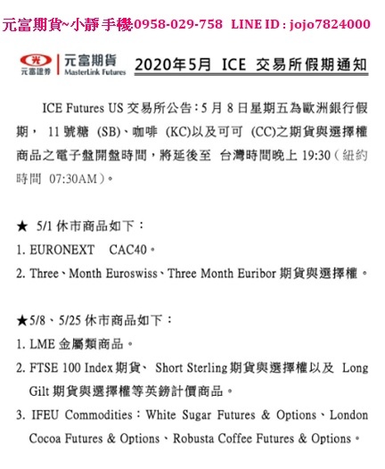 ICE Futures US 交易所公告:5月6日星期一是歐洲銀行假期
