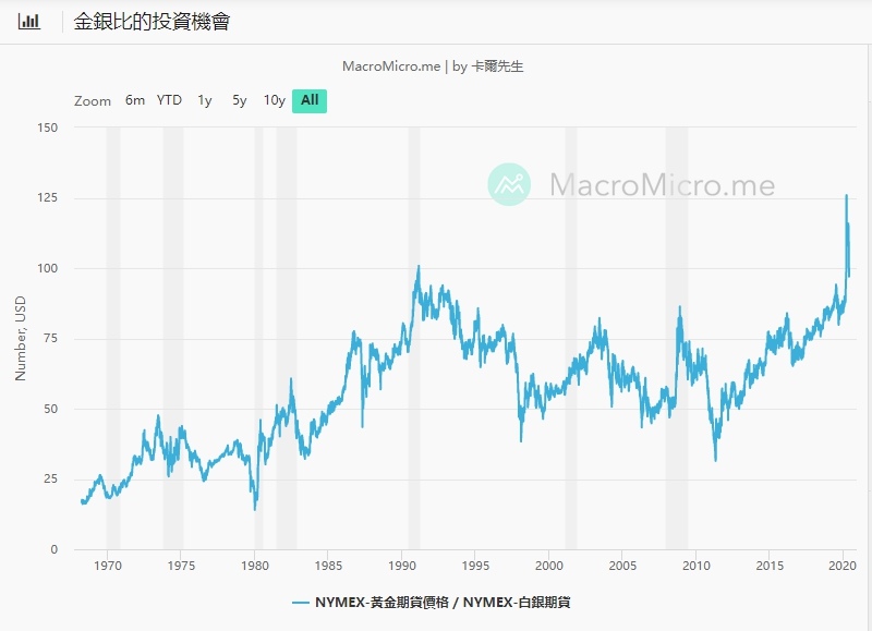 1.白銀是黃金的好兄弟,黃金價格除以白銀價格的比例稱為金銀比,從1969年到2019年間,過去50年的平均為57,過去25年平均為64,過去10年平均為66,過去1年平均為80,金銀比漲高後大概率會回歸中間值。