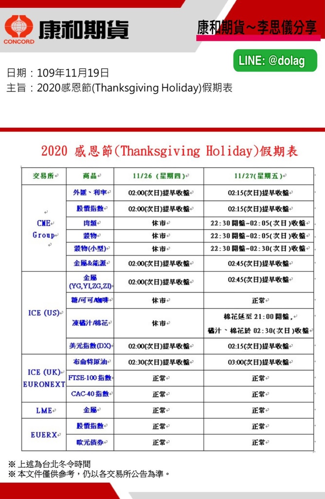 2020感恩節美股休市表 11/26、11/27海外期貨休市表