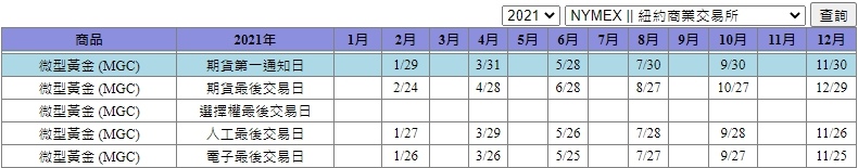 最新微型黃金網路最後交易日查詢: [url]https://www.concordfutures.com.tw/exchange_tradeDay.htm[/url]
