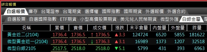 康和期貨李思儀 | 黃金期貨 | 微型黃金 | 微型白銀 | 所屬交易所 | 芝商所 CME | 代碼 | GC | MGC | SIL | 原始保證金 | 11,000美 | 1,100美 | 3,630美 | 約當台幣 | 317,130元 | 31,713元 | 104,653元 | 最小跳動點價值 | 0.1點10美 | 0.1點1美 | 0.5點 5美元 | 交易月份 | 2.4.6.8.10.12月 | 1.3.5.7.9.12月 | 台灣夏令交易時間 | 06:00~05:00 | 成交量 | 1 | 2 | 3 |