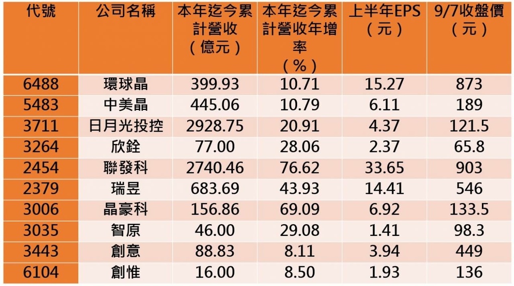 矽晶圓業者,可觀察環球晶(6488)、中美晶(5483);封測領域,有日月光投控(3711)和獲利面表現亮眼的欣銓(3264);IC設計方面,以聯發科(2454)為代表,雖然近期股價表現不特別強勢,但基本面不錯,後續可望有補漲機會。