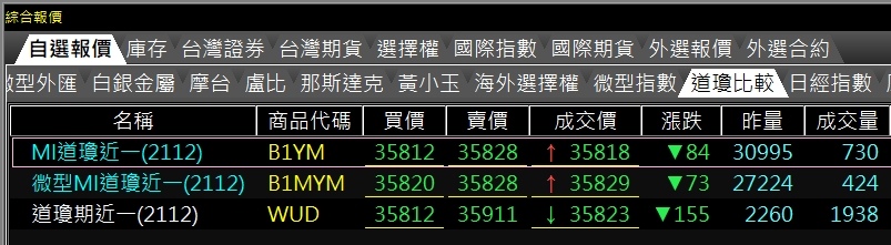 依序成交量排行:小道瓊期貨>微型道瓊期貨>台灣道瓊期貨