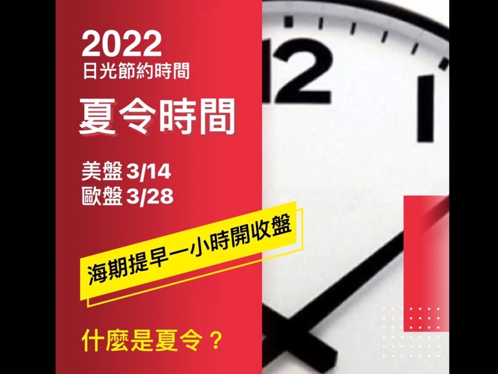 2022夏令時間(日光節約) 海外期貨提早一小時開盤收盤囉!
