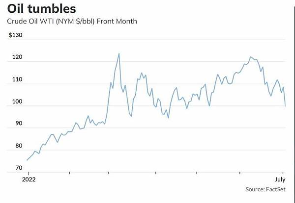 對經濟衰退和能源需求下降的擔憂令周二 (5 日)WTI 原油期貨價格跌破每桶 100 美元大關,為多月來首見。