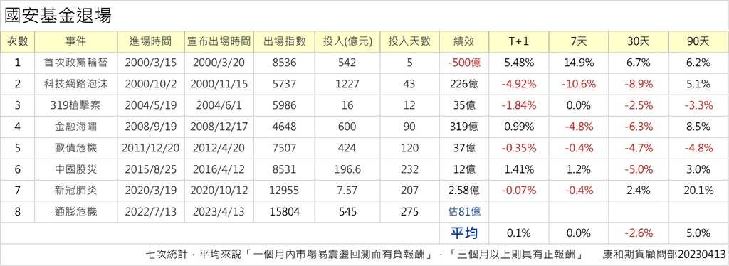 國安基金委員會議指出,去年7月13日起執行護盤任務以來,最近全球通膨升息放緩,國際股市回溫,護盤期間台股累計上漲1,854.14點,累積漲幅13.29%,僅次於美股費半指數19.32%,優於美股的道瓊、那指及標普三大指數及韓、日、陸、港等主要股市,顯示國安基金確有發揮穩定市場及激勵投資信心成效,已無「國家金融安定基金設置及管理條例」的護盤需要條件。