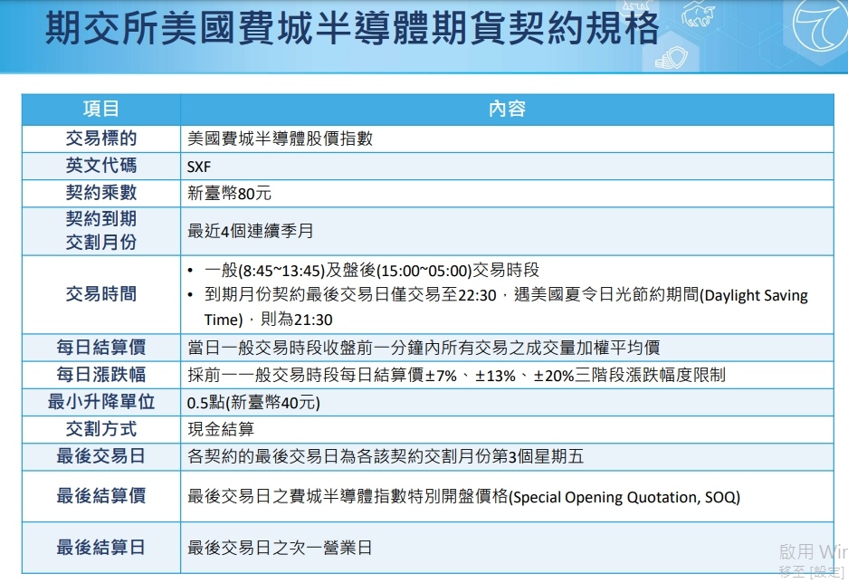 - 同CME E-mini費城半導體期貨,最小升降單位亦為0.5點