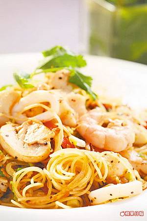 XO醬海鮮天使麵280元 天使麵吸附了醬料,嘗來略帶嗆辣。